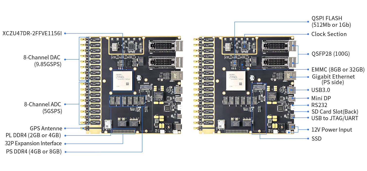 - 8-channel ADC/ sampling rate 5Gsps,8-channel DAC/ sampling rate 9.85Gsps