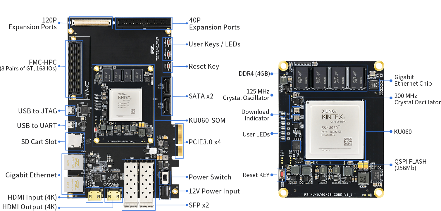 - Reserved ports Gigabit Ethernet、FMC、HDMI、PCIE、SFP,etc