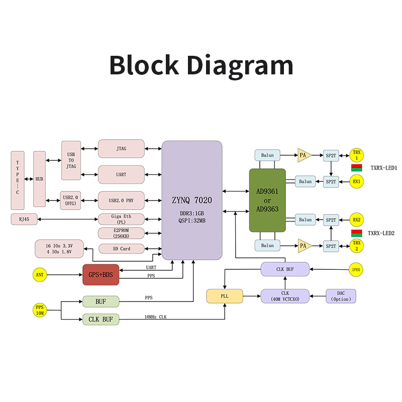- RF chip AD9363,Frequency range 325M-3.8Ghz,Signal bandwidth 200K-20Mhz