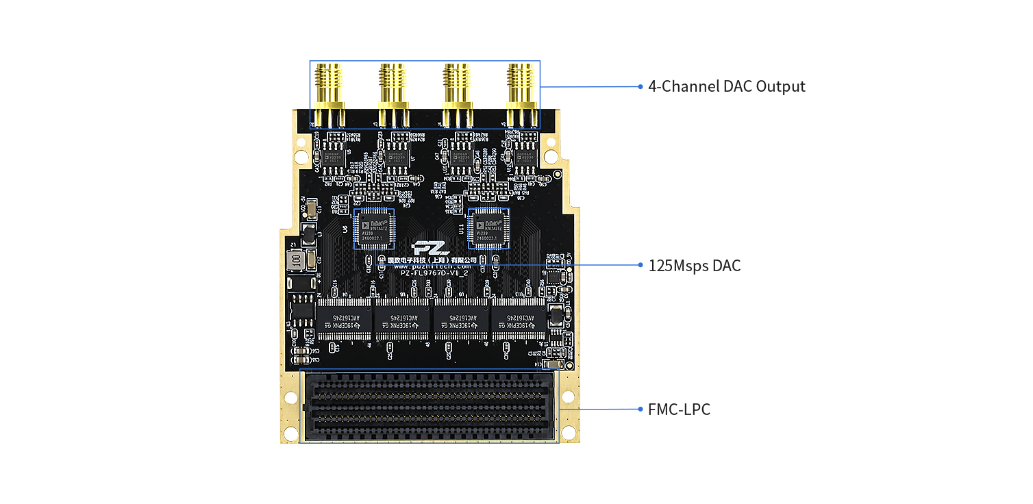 - Four-channel high-speed DAC,14bit/125MSPS high sampling rate