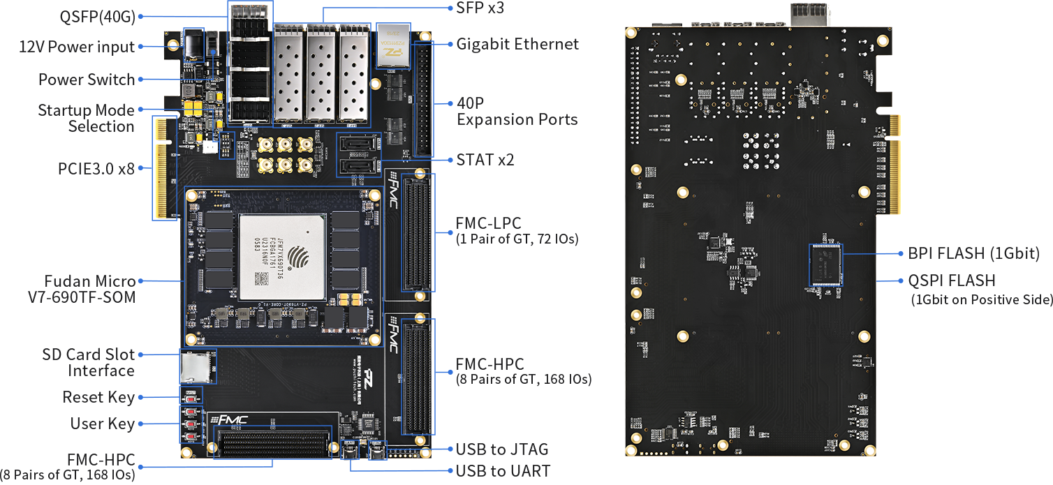 - Reserved ports Gigabit Ethernet、SATA、SFP、PCIE、FMCx3、QSFP,etc