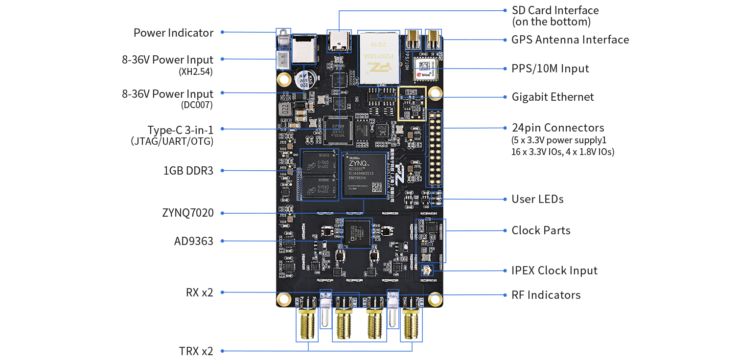 - RF chip AD9363,Frequency range 325M-3.8Ghz,Signal bandwidth 200K-20Mhz
