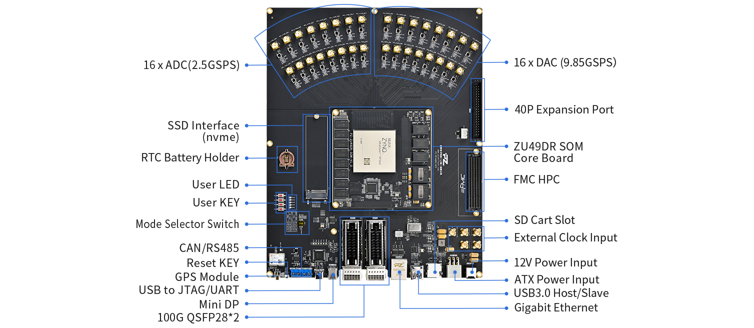 - 16-channel ADC/ sampling rate 2.5Gsps, 16-channel DAC/ sampling rate 9.85Gsps